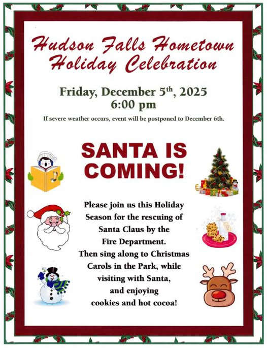 Hudson Falls Hometown Holiday Celebration with the rescuing of Santa by the Fire Department, followed by Christmas carols in the park, and visits with Santa Claus.