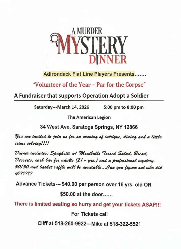 It's a night of mystery and mayhem when the Adirondack Flat Line Players present "Volunteer of the Year - Par for the Corpse", a fundraiser to support the Operation Adopt a Soldier.