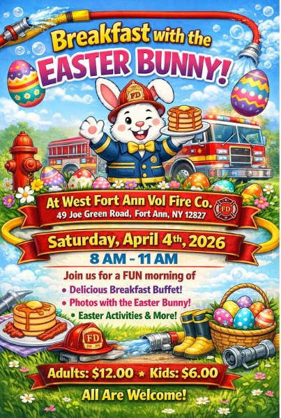 Come on by the West Fort Ann Volunteer Fire Company on Joe Green Road in Fort Ann on Saturday, April 4th as the Easter Bunny will joining for breakfast. Bring your child for photo opportunities and a delicious breakfast.